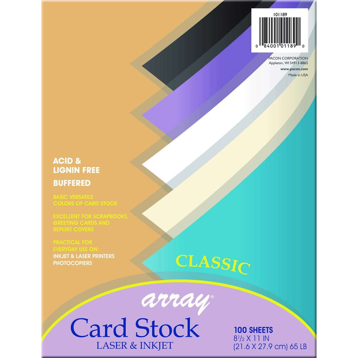 Heavyweight 65 lb. cover perfect for greeting cards, postcards, report covers, rubber stamping, memory books, flyers, announcements, and more. Lignin free, buffered. Acid-free. 8 1⁄2" x 11", 100 sheets per pack. Ivory, Black, White, Violet, Cobalt Blue.