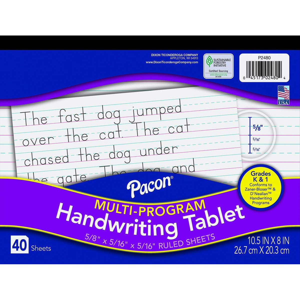 Our Pacon® Multi-Program Handwriting Papers offer rulings that conform to both the Zaner-Bloser™ and D'Nealian™ handwriting programs. Bright tablet paper ruled both sides with red baselines, blue dotted midlines and blue headlines. Recyclable. Ruling: 5/8" (long way) Dotted Midline: 5/16" Skip Space: 5/16"