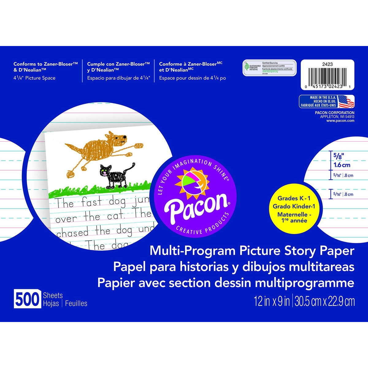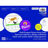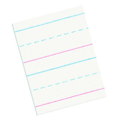 Bright tablet paper ruled both sides with red baselines, blue dotted midlines and blue headlines. Picture Story paper is ruled with a 4 1/4" picture space on both sides. Recyclable.