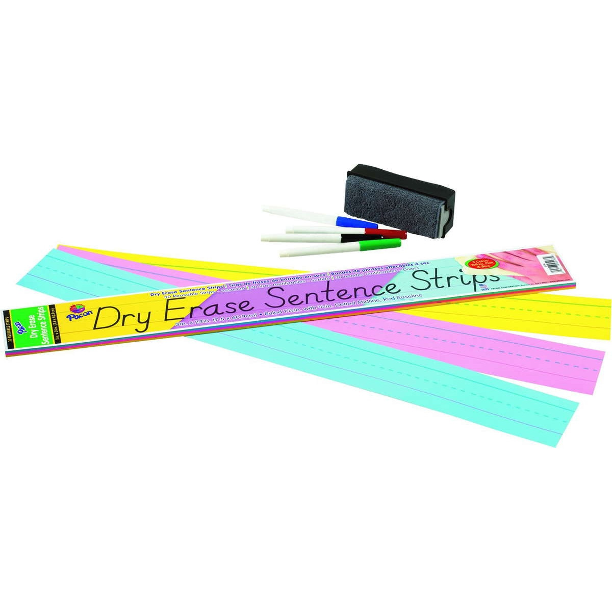 The dry erase surface makes these sentence strips convenient and reusable. Ruled 1 1⁄2" with red baseline and 3⁄4" dotted midline. Dry erase surface on one side. Assorted pack contains blue, pink and yellow. 30 strips per pack.