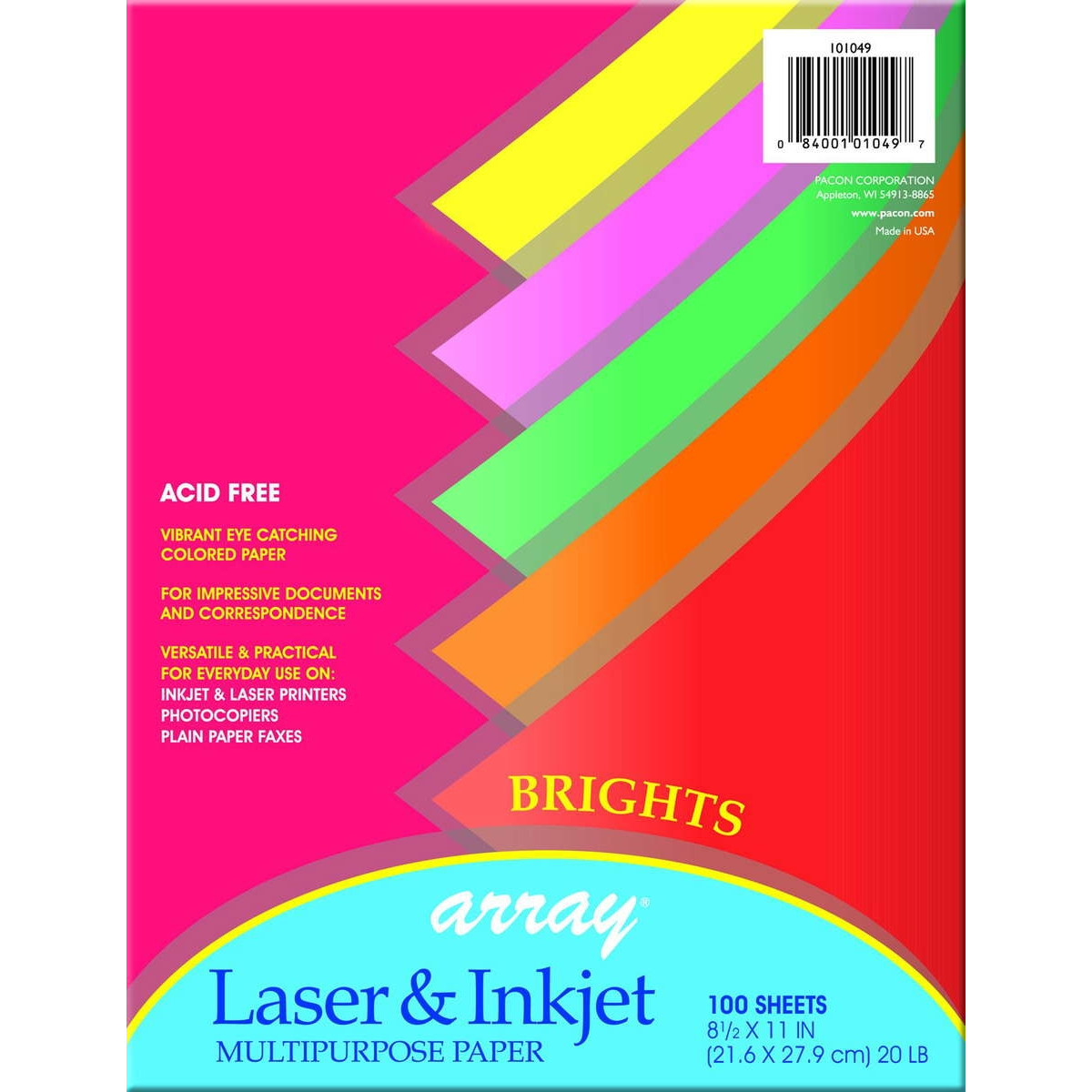 High-impact colors make your messages bright. For flyers, reports, personalized stationery, announcements, newsletters and memos. Made from sulphite bond, perfect for high speed copiers, laser and ink jet printers. Acid-free. 8 1⁄2" x 11". Emerald Green, Rojo Red, Lemon Yellow, Pumpkin & Hot Pink.