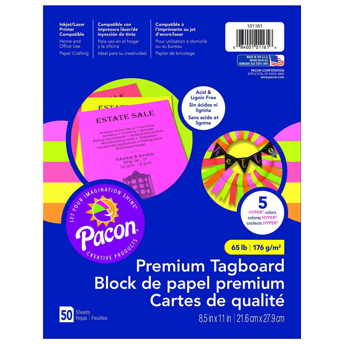 Strong 65 lb. paper great for art projects, crafts, card and recipe making and more. Inkjet and laser printer compatible. Acid free. 8-1⁄2" x 11". 50 sheets. Colors included: Hyper Yellow, Hyper Pink, Hyper Orange, Coral Red, & Hyper Lime.