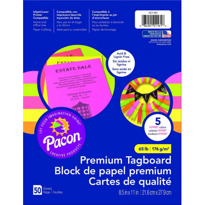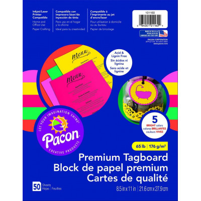 Sturdy super bright tagboard adds color and excitement to any poster sign or art project. Five colors available in each assortment in two convenient sizes. 100 sheets per film wrapped package. Assorted colors include: Bright Pink, Bright Orange, Bright Lime, Bright Yellow and Bright Blue. Acid free. Recyclable.100 sheets.