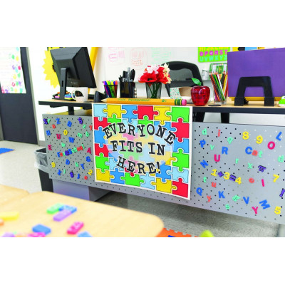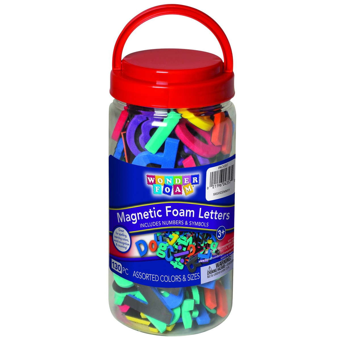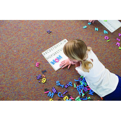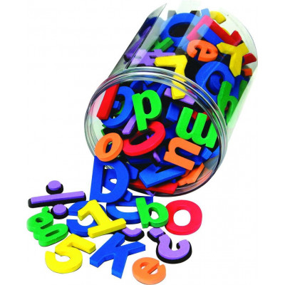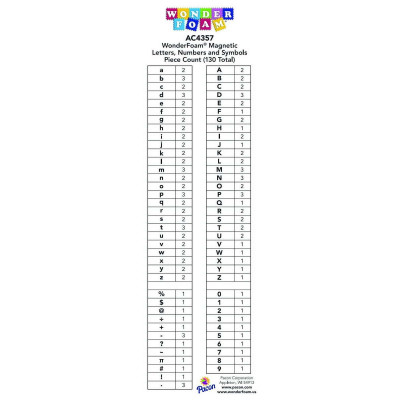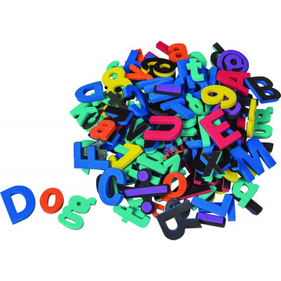 Durable, washable foam letters and numbers have a magnetic backing. Set includes upper and lower case letters, numbers, punctuation marks and math symbols which are color-coded to help early learning. Upper case letters and numbers are 11⁄2"H and lower case letters are 1". 105 pieces.