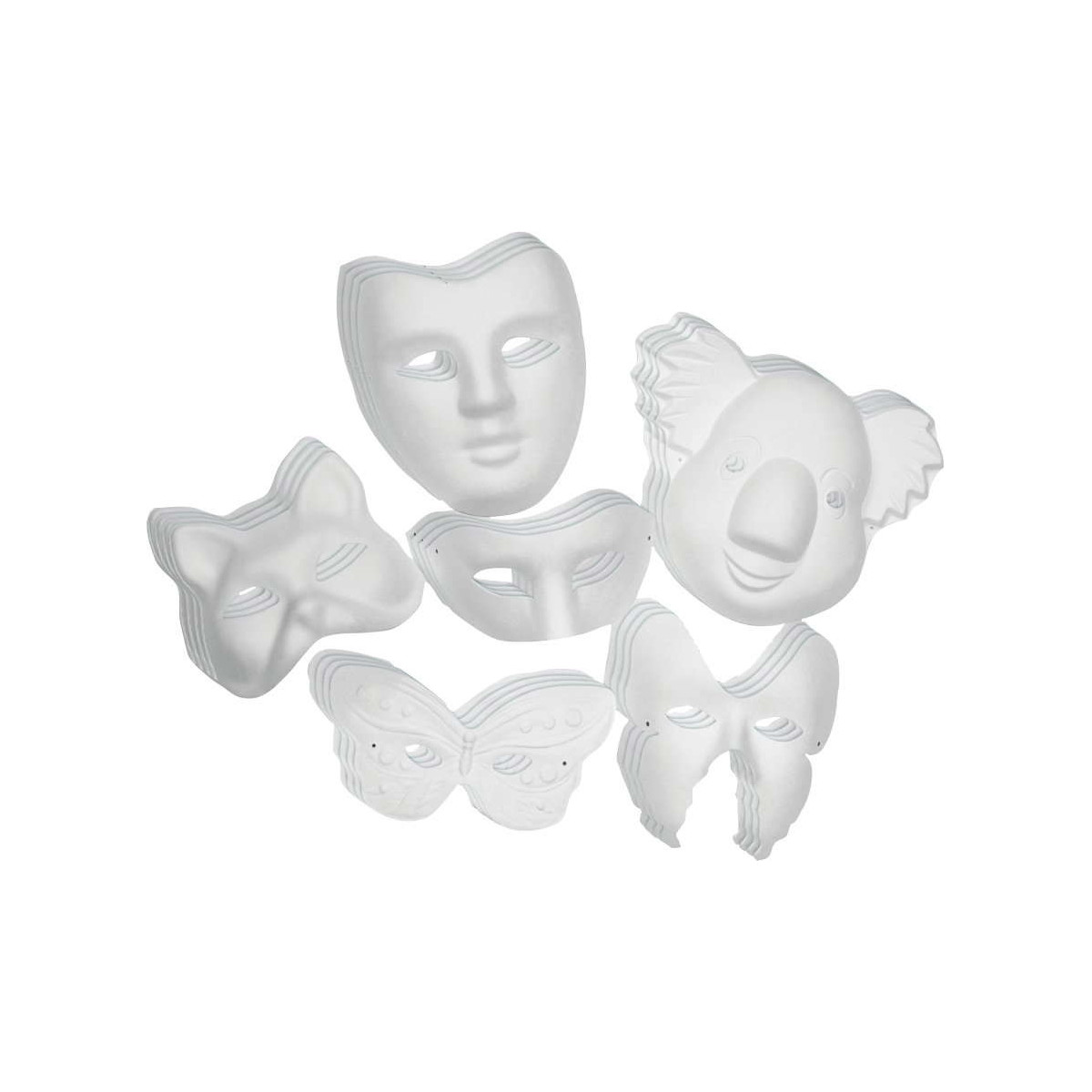 Sturdy paperboard can be decorated with crayons, paints, markers and glued objects. Each mask includes a pre-attached elastic cord. 24 piece set includes 4 each of 6 fun designs - Koala, cat, marauder, half & full butterfly and full face.