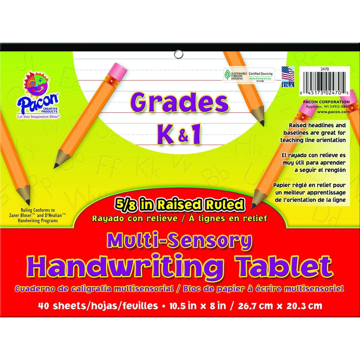 This unique paper helps teach handwriting through two senses – sight and touch. The raised blue headlines and red baselines help students stay within the guidelines. Features a 5⁄8" ruling, 5⁄16" dotted midline and 5⁄16" skip space. Conforms to both D’Nealian™ and Zaner-Bloser™ handwriting styles. 101⁄2" x 8". 40 sheets.