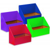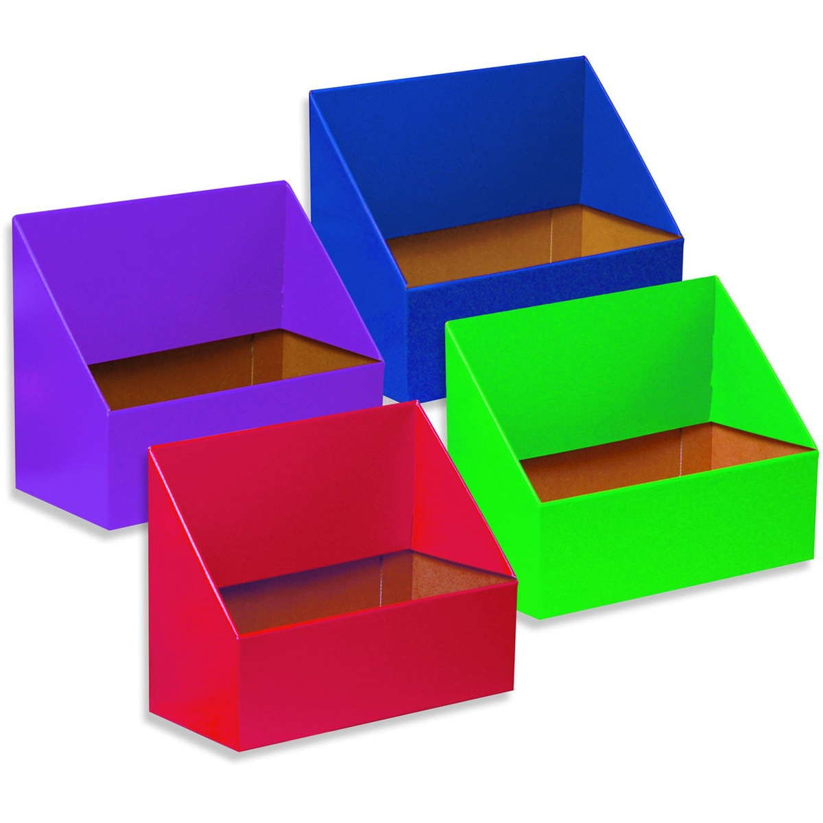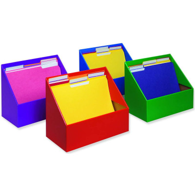 Organize your files for easy reference. Long angle cut reveal files at a glance. Durable and transportable. The coated finish helps protect them during daily use. Fits in any office or classroom setting. Four color assorted pack. Colors include: Red, Green, Blue and Purple. Recycled and recyclable. Set of 4.