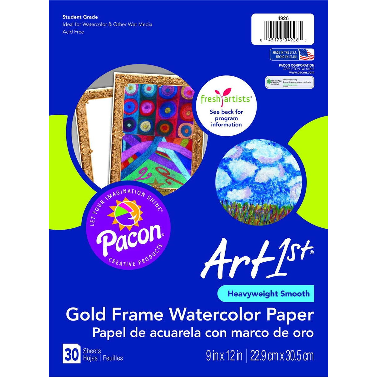 We have created this package of watercolor paper in collaboration with the Fresh Artists®Program. The package contains student grade watercolor paper adorned with a gold frame that will turn any work of art into a finished masterpiece! It's the perfect paper for all ages. Acid free. Recyclable. 30 Sheets per pack.